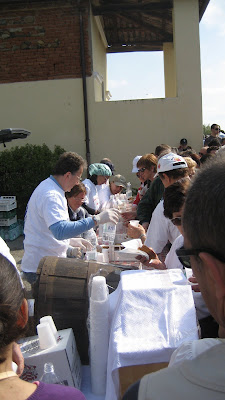 La Camminata Gastronomica fra i ciliegi in fiore, is literally the food walk through the cherry trees in bloom. Over 4300 people showed up for the 27th annual event on Sunday, April 6th, so ive been told by my landlord, the greatest gossiper in town, and mind you there are only 1500 people in Pecetto proper. People came from near and far for the non-competitive 8km race, that gave out a total of 15 prizes, including first Pecettese man, woman, and first three animals to cross the finish line....this was not just a walk through the beautiful hills that sorround pecetto, to attract these numbers, food and wine must be involved, and someone with a megaphone and a lottery. There were six tasting stops....degustazioni....starting with milk, hot chocolate, red wine, white wine (10am start), then it was onto the cherry marmellate on toast with wine, 3rd stop cherry punch with more wine...4th stop, panini with prosciutto and wine, 5th stop...fruit, dont think there was wine.....6th stop, toasted bread with olive oil, garlic, and finally some water.....finish!